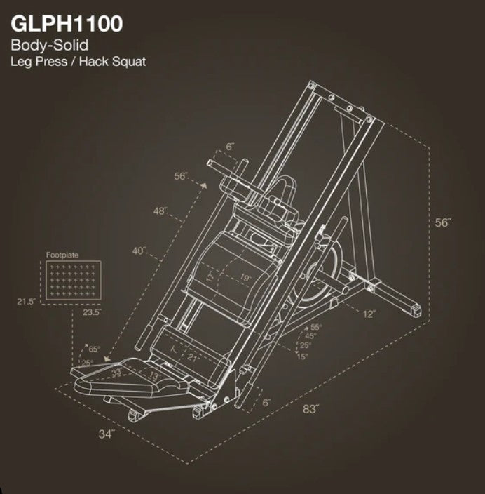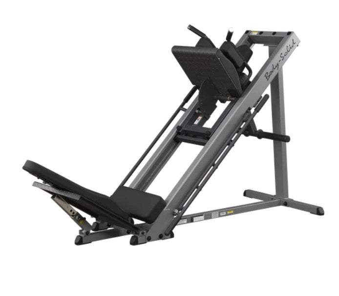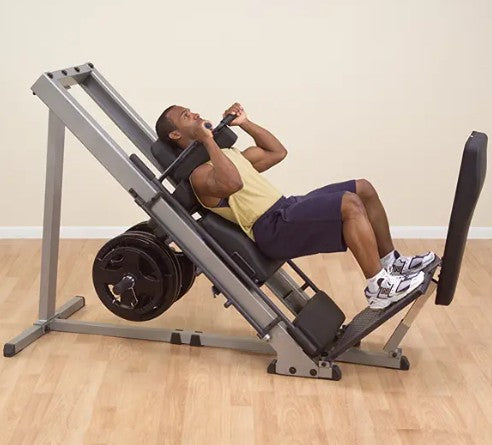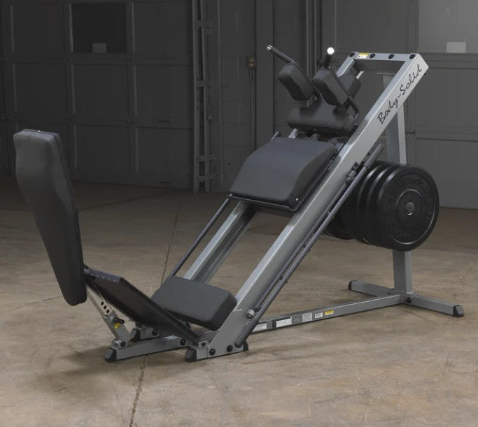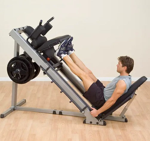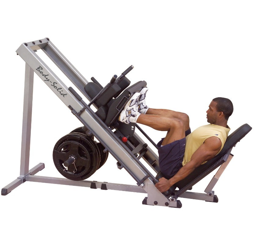 Body-Solid engineers knew that the best way to build an explosive lower body, and stay that way, would be to make your workouts incredibly Powerful... Comfortable... and Safe. As you work your quads, glutes, and calves, the engineered smoothness of the Leg Press/Hack Squat Machine spares your bones and joints. Three lockout positions are under the user’s control throughout the exercises and provide user safety and the option of different start/stop positions. Olympic style plates only. Standard Weight plates with optional attachment.
